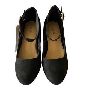 Luoika Wm’s Sz 7 Black Suede Ankle Strap Round Toe Pump Shoes