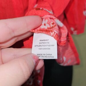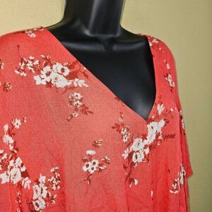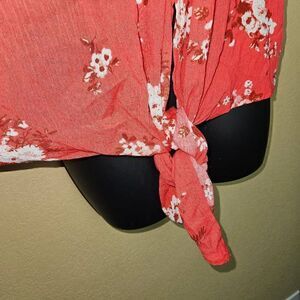 This is a short sleeved blouse by Luq. It is coral with white floral print and a front knot detail near the hem.