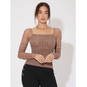 Lurex Sheer Mocha Brown Tan Long Sleeve Square Neck Ruched Tee Top Shirt