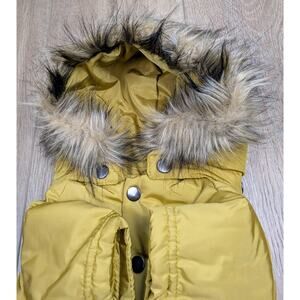 Lined gold jacket with snap front closure and removable (snaps) faux fur trimmed hood. Cute Air Force patch and patch pocket with a Velcro close on the back.