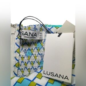 Brand new with tags Lusana strapless mini dress in a vibrant geometric print. Crafted from 100% organic cotton poplin, this dress features a fitted strapless bodice with smocking in the back for added comfort and a concealed back zipper for a secure fit. The skirt falls to a flirty mini length, making it perfect for summer events, vacations, or casual outings.