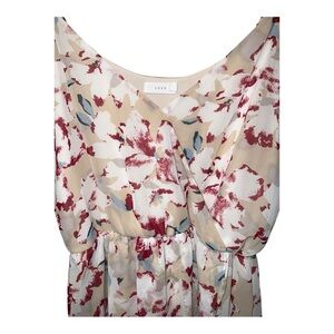 Beige with red, white, and blue abstract floral print. Adjustable straps, V-neckline, high-low hem. Fully lined.