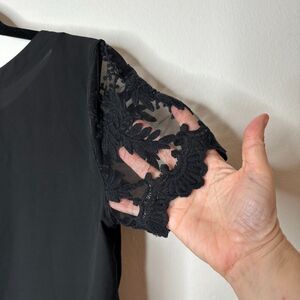Lush Black Sheer Mesh Floral Lace Short Sleeve Keyhole Button Flowy Blouse M