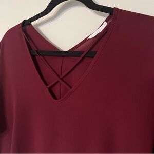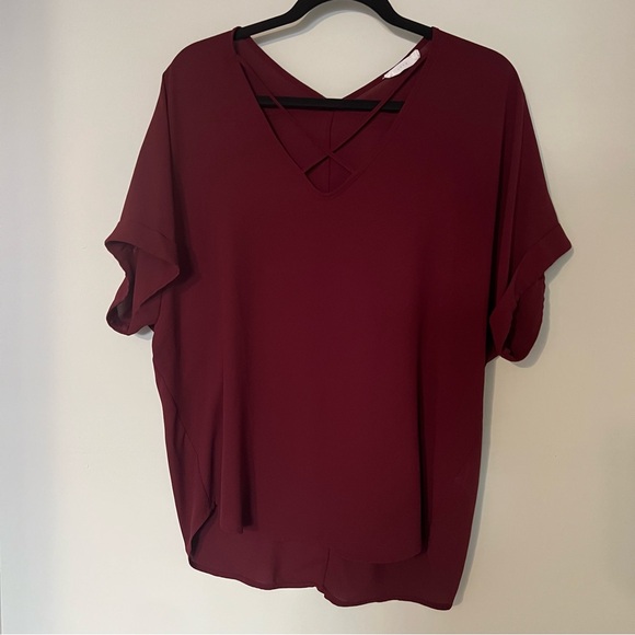 Burgundy blouse with cross neck detail, cuffed sleeves, and high-low hem.