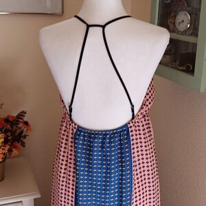 This colorblock maxi is a semi sheer overlay with full cream lining. Halter top. Black trim at chest. Adjustable spaghetti straps. Size L measures 40 at chest, 30-38 under chest, full skirt, 50 at hips. 60 long from shoulder to hem. Quirky Y2K fun.