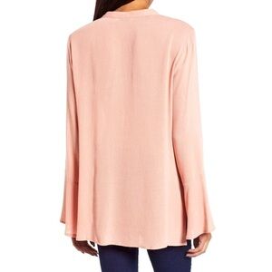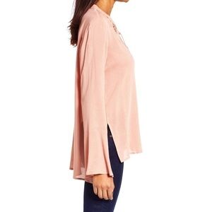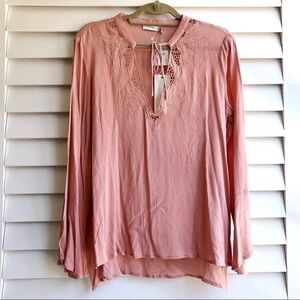 Lush Crochet Trim Bell Sleeve Top in dusty mauve color. Delicate floral crochetwork trims the split neckline of this ethereal, bohemian blouse with breezy bell sleeves. Split neck with tie closure. Long bell sleeves. Semi sheer (base layer recommended). 100% rayon. Approx. 25" front length, 28" back length and 20” across from armpit to armpit. Brand new with tags.