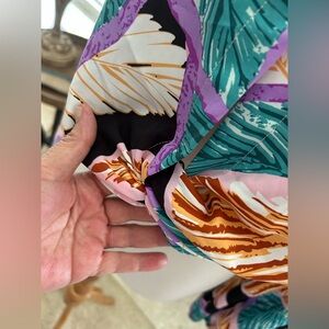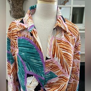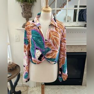 This stylish top from Lush features a vibrant mix of orange and blue hues in a modern geometric print. The long sleeves and notched collar add a touch of elegance, while the cropped, tie-front design offers a trendy twist. Perfect for making a bold statement, this lightweight shirt is ideal for any casual outing. Size Large