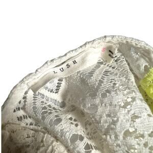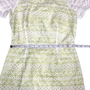 Lush white lace short sleeve open back sheath mini dress with neon yellow green lining. Women's size Small