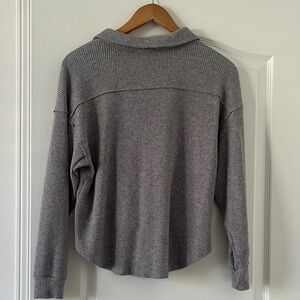 Stylish ribbed top with button-up front. Features a chest pocket and classic collar. Perfect for casual wear.