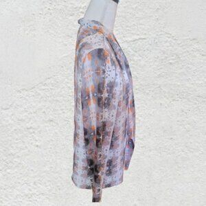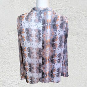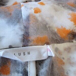 Very pretty almost sheer type jacket by Lush. It is gray, white, orange and black in color. No buttons, open jacket. It has long sleeves and a rolled neckline. Would look great with black slacks and a pretty camisole matching one of the colors in the jacket. Light weight, very comfy.