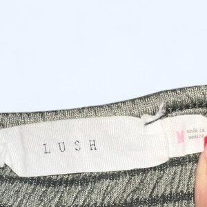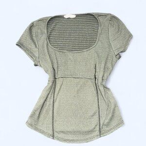 Square neckline with puff sleeves and fitted waist detail. Stretchy, lightweight fabric perfect for casual or dressy looks.
