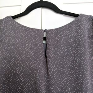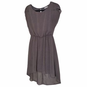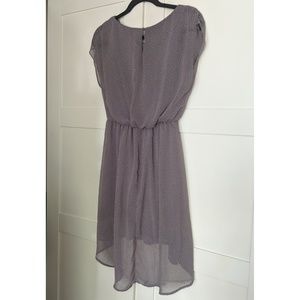 Lush grey & pink polka dot dress. Sheer, gauzy high low / hi-lo fabric over lining, elastic waist for fit and stretch, flutter sleeves, and button back.