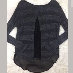 Gently used Lush grey and black striped long sleeve shirt with open/opaque back, size small. The front is very lightly woven so it needs a cami underneath. You'll be able to see a bra through the shirt. On the mannequin the back looks grey but it is a black fabric, the mannequin is stark white so it shows through. The shirt is flowy and loose. Dry clean only due to the gentle loose weave of the fabric. I don't think it would survive a normal washing machine unless you put it in a laundry bag.