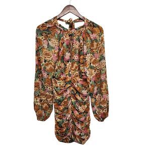 LUSH Mock Neck Open Back Floral Dress. camel fuschia green