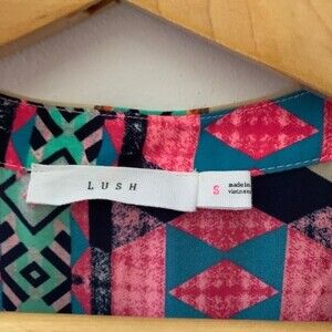 Great blouse by Lush. Sleeveless blouse with navy buttons going down. Has a drop tail and one pocket. Tribal print with lots of fun bright colors. Like new condition. Reasonable offer’s considered.