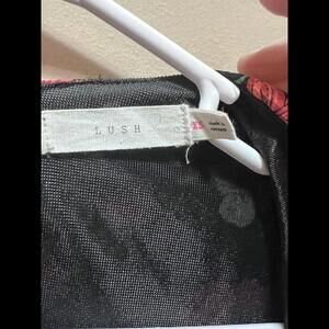 This Lush floral maxi dress in women's size XS features a collared neckline, sleeveless design, and a side slit. Made of polyester knit fabric, it has a tie closure and ruffle accents. The dress is black with a colorful floral pattern, suitable for parties, casual, or formal occasions in spring and summer.
