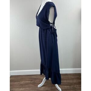 Lush Navy Blue Lace Trim Gauze V-Neck High-Low Sleeveless Midi Dress Large