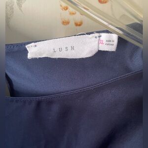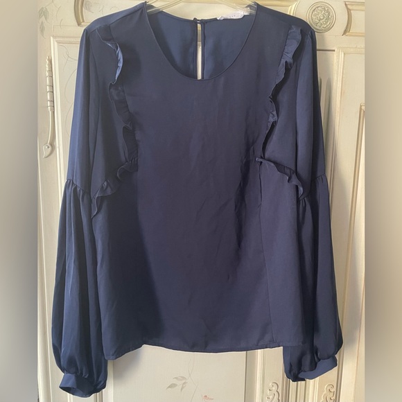 Chic navy blouse with ruffle accents. Long sleeves add elegance. Perfect for versatile styling.
