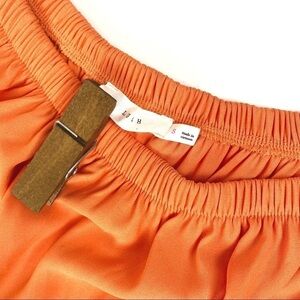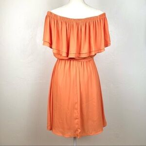 Lush chiffon dress with double layer ruffle around bodice. Fabric belt tie (belt in main photo not included). Elastic waist. Lined skirt. Pretty tangerine color. I think the color in real life is slightly lighter than what the camera catches.