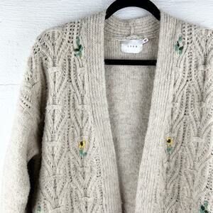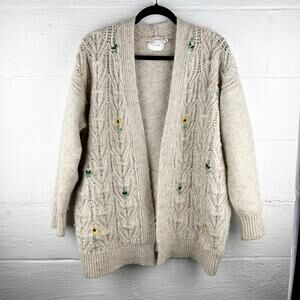 Lush Open Front Chunky Knit Sunflower Cardigan Tan Floral Embroidery Size L