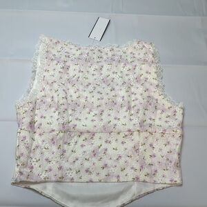 Elegant crop top with floral design. Features lace trim and bow detail. Dainty flowers and lace trim sweeten a sleeveless crop top adorned with airy embroidered eyelets for sunny-day appeal.