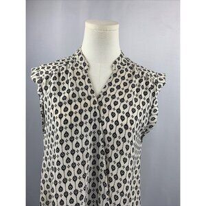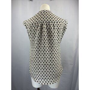 A refined sleeveless blouse featuring an intricate geometric floral pattern, offering versatile styling for professional and creative work environments. Tailored with a crisp silhouette and delicate cap sleeves, this piece transitions seamlessly between office and evening settings.