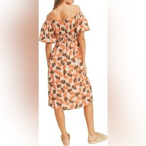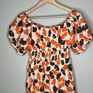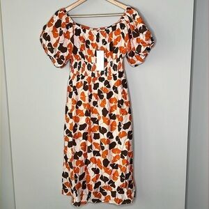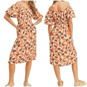 Lush Puff Sleeve Off Shoulder Midi Dress in Orange & Brown Floral Gingko Print