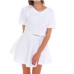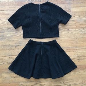 Super fun set with quilted pattern throughout. True crop top. Circle skirt. Soft fabric. Very minor pilling on back waistband, hard to notice due to soft fabric. Fabric keeps its shape for a bouncy skirt and boxy crop. Worn just once to a dinner.