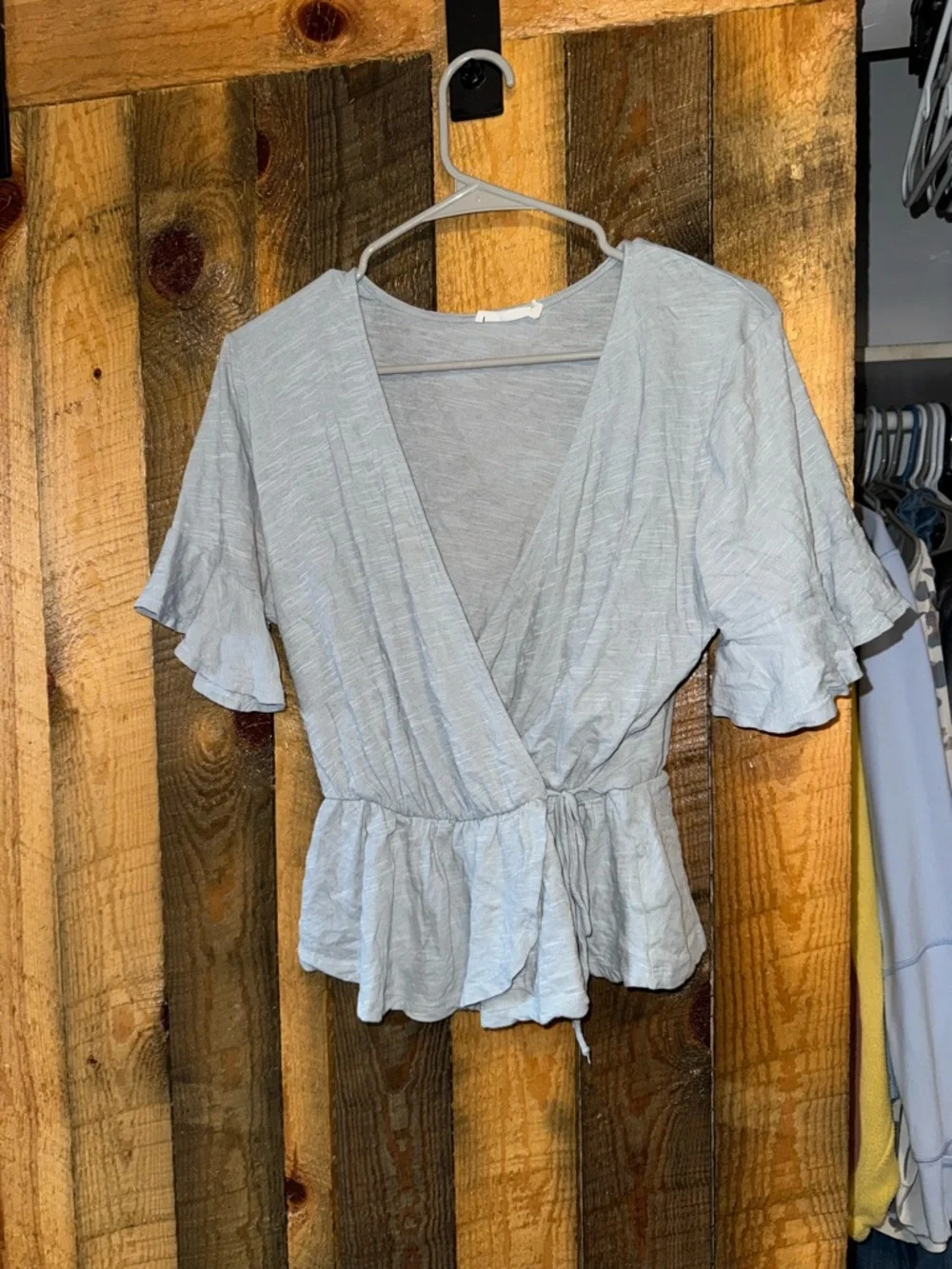 Light blue wrap top with a V-neckline. Drawstring waist for a fitted shape. Short ruffle sleeves and peplum hem. Soft, lightweight knit fabric. Easy to dress up or down.