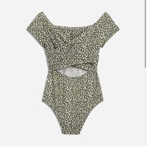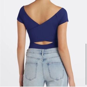 Details: Off the shoulder, stretch, full bottom with snaps, criss-cross back