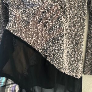 Women’s size medium Lush loose tunic style top. Black and light pink textured loose knit sweater type stretchy material with black sheer trim. Very flattering fit. Great preowned condition, clean nonsmoking home.