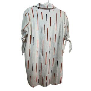A versatile shirt dress that combines professional aesthetics with contemporary design, featuring a crisp white background adorned with asymmetrical red and navy vertical stripes. The garment offers a refined silhouette with buttoned placket and elegant tie-detailed sleeves.