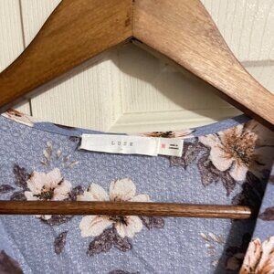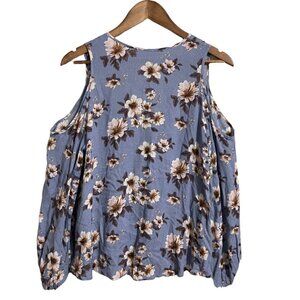 Lush Womens Blue Floral Faux Knot Cold Shoulder Surplus Vneck Blouse Medium Measurements Underarm to underarm: 21" Length: 23" Sleeve: 15" Offers always welcome! Measurements are approximations taken while hanging
