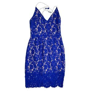 Make a statement in this vibrant cobalt blue dress from Lush. Featuring a stunning floral lace overlay with nude lining, this sleeveless design includes a V-neckline, adjustable spaghetti straps, and a lace-up open back for an elegant yet flirty touch. The fitted silhouette and scalloped hem make it ideal for weddings, date nights, or special occasions. Size Medium. In excellent condition. Comes from a smoke-free, pet-friendly home.