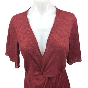 Lush Women's Red Burgundy Twist Knot Front Short Sleeve V-Neck Midi Wrap A-Line Dress S