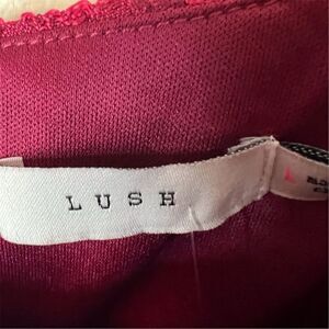 This Lush dress in size large features a red floral jacquard pattern with a knee-length design. It has a square neckline and short puff sleeves, making it suitable for formal occasions. Crafted from polyester, the dress is designed for the fall season and offers an elegant, sophisticated look. It is a pullover style, manufactured in China, and requires hand washing. The dress is pre-owned.