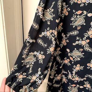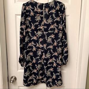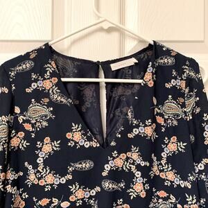 Lush floral shift dress. Beautiful navy with floral print; split sleeves and keyhole neck. Sheer outer layer with interior lining. The care tag is missing but I believe the material is polyester. Very good used condition!