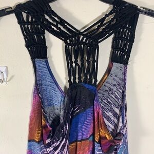 Lush racer back tank in multi color abstract design with black woven macrame straps. Size tag is missing but fits like a S/M. Length is 16” in front, 21” in back. Bust is 17” across.