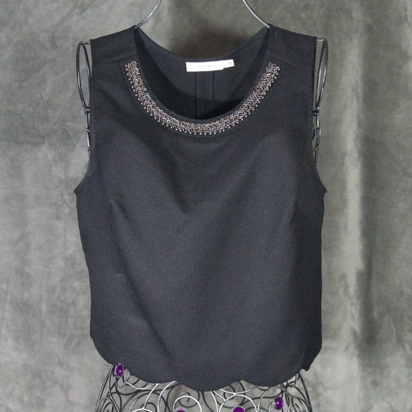 Lush size M black cropped scallop top. It has a jewelry neck detail.