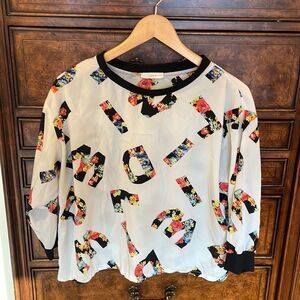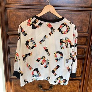 Lush woman’s white blouse with black letters and flowers all over the top. This top is super cute and in good condition.