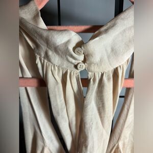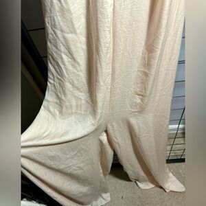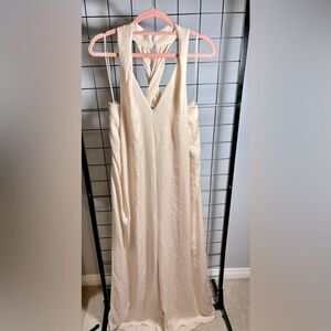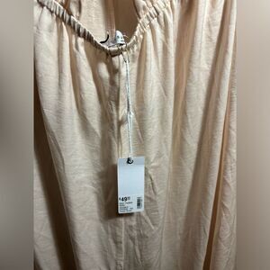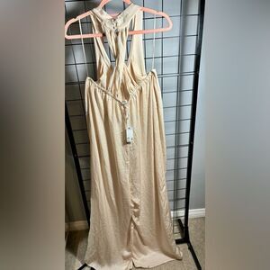Gorgeous Lush jumpsuit in cream. Wide leg style with a v-neck. Has 2 belt loops to create an accentuated waist and make it look like a wide leg pant with top combo. Belt is not included. Very lightweight material. Button at the back of the neck. Elastic at the back to keep it from sliding down. Absolutely beautiful. Perfect for a vacation or beach getaway. Measures about 18.5” p2p and a 26.5” inseam. New with tags.
