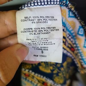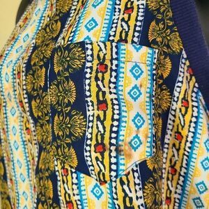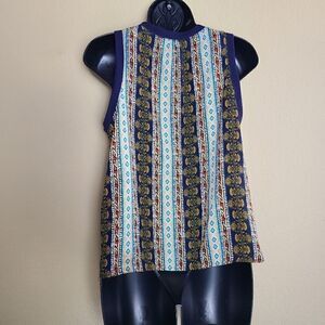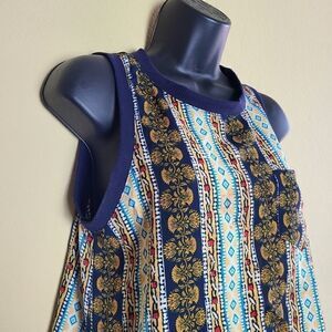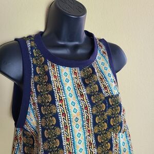 This is a sleeveless top by Lush. It has various print in a vertical stripe pattern. The main colors are blue and gold. There is a small pocket on the chest. The back is slightly longer than the front.