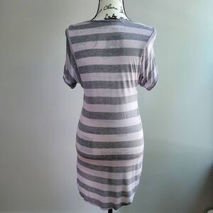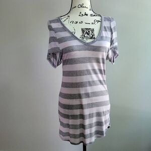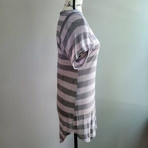 Lush large silk blend grey & lilac striped tunic top cap sleeve split curved hem. In excellent pre owned condition with no signs of wear or damage.