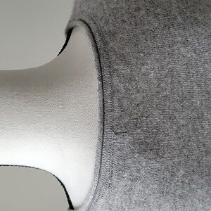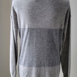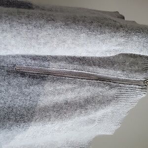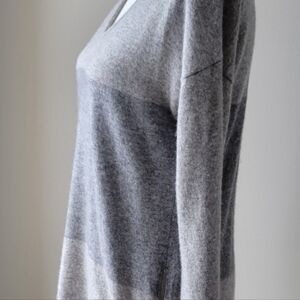 Pre-owned, this 100% cashmere v-neck sweater is in excellent condition, no holes, no snags, no stains, and very little piling. Soft to the touch, colors are light gray and dark gray, hi low hem, silver zippers one on each side.