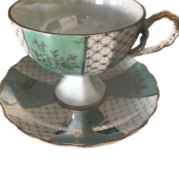 Lusterware Pedestal Teacup Saucer pistachio gold signed Collectors item