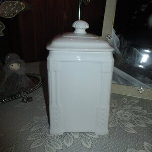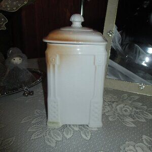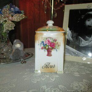 Beautiful Antique Lusterware, Made in Czechoslovakia, Flower Basket Porcelain Flour Canister, Peach & Green Luster with Rose Flower Basket, 8" Tall, 4" Wide, 4" Deep, Mint Condition