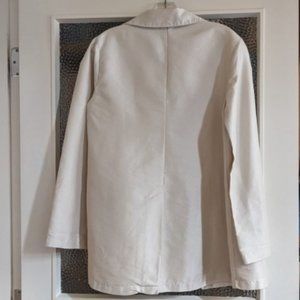This great swing-coat style jacket in a light creamy color, not quite tan, has a great A-line shape, an oversized collar and beautiful faux-shell buttons that close in loops. Unlined, it feels like a comfortable and smooth light cotton canvas on the inside but on the outside it has a lustrous mercerized satin-like sheen to it, making it especially stylish and posh. The fabric will wear well and hold its shape over time. The cut is generous without looking boxy; it can be worn over a little or a lot, and will serve as a polished outer layer, a light wind-buffer, or just to evoke a retro 1960s style. Three smooth plastic rippled faux-shell button with loop closures pull the coat together gracefully if desired; it looks good worn open or closed. Pretty side pockets on the seams (see pics), a back vent and a pointed collar complete the chic retro look of this great coat. Purchased new in the 1990s, the jacket has never been worn; it is in absolutely perfect condition. GG Sport brand, made in Canada. Great style, quality and fabric.