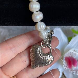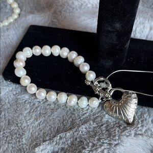 This beautiful bracelet showcases lustrous pearls paired with a stunning silver heart charm, perfect for any occasion.