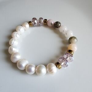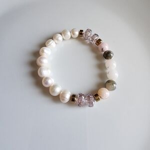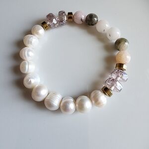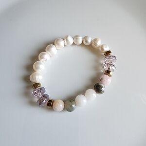 This stunning bracelet showcases lustrous white pearls and soft pink and purple gemstones, enhanced by elegant gold accents. A perfect accessory for any occasion. NEW HANDMADE ✨️