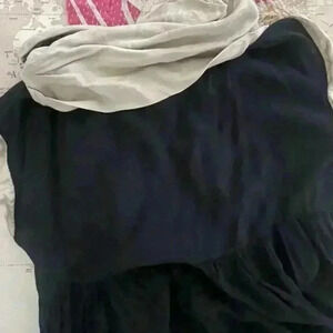 Lightly sheer black boxy tunic style dress, boxy sleeve with contrast trim, high collar can lay flatter is also the contrast beige as trim. Knee length and slightly high low.